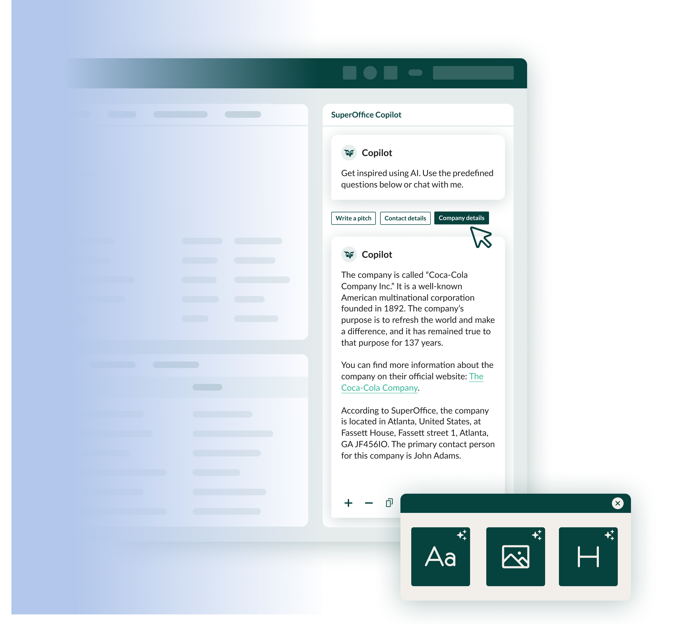 Få øjeblikkelige oversigter over indkomne tickets og din kalender. Få indsigt i hele dit CRM –system på få sekunder. Opret personaliserede tilbud, præsentationer og skræddersyede kampagnebilleder. Det har aldrig været nemmere at styrke hele din organisation til at opbygge bedre relationer – nu med hjælp fra AI i din SuperOffice CRM.