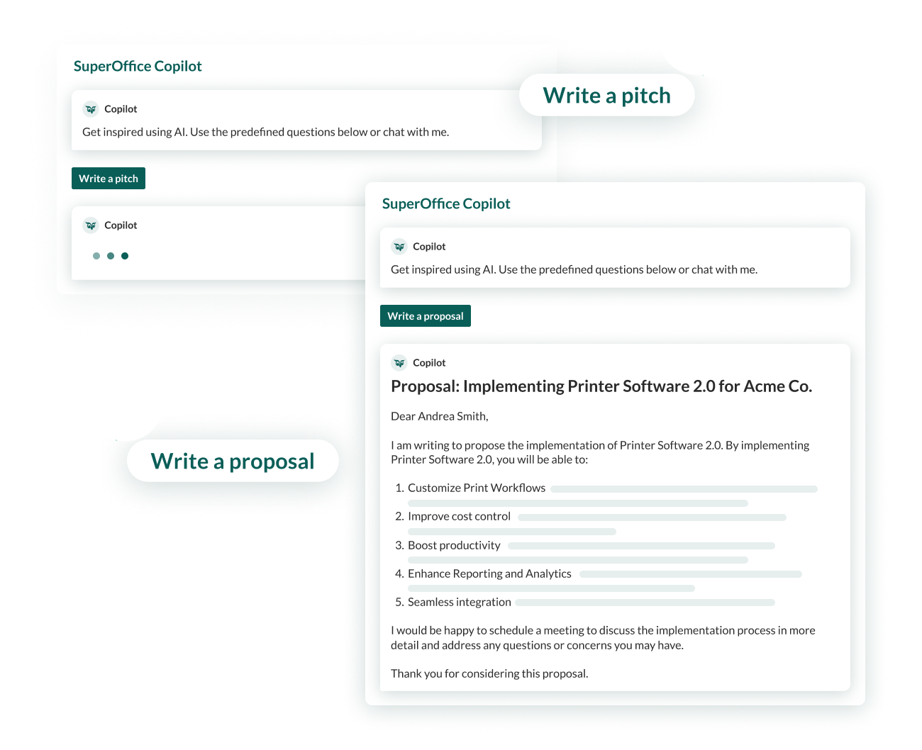 - Kom i gang med at skrive med det samme med SuperOffice Copilot, der kombinerer dine egne idéer med nye perspektiver