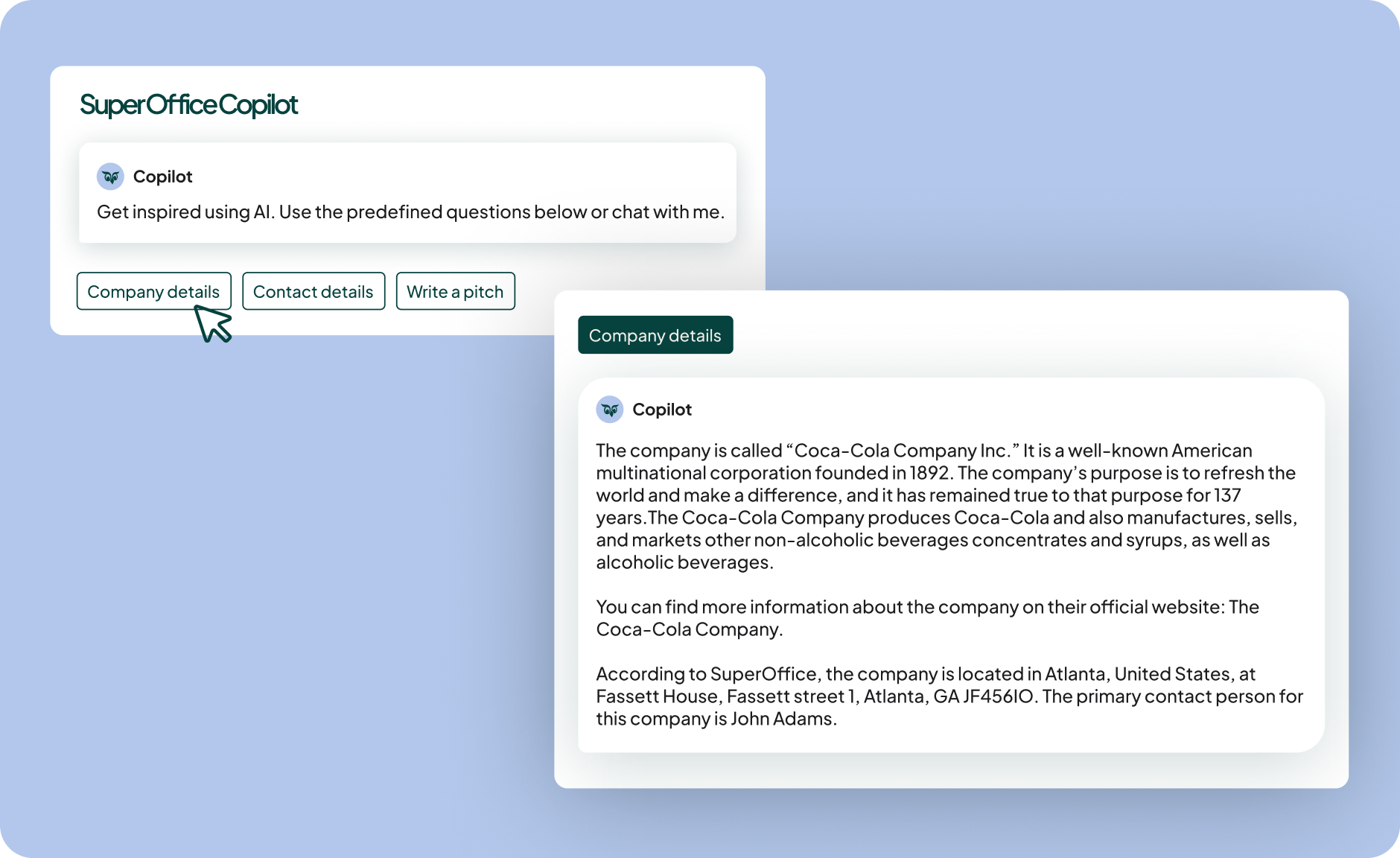 De bedste beslutninger tager højde for alle vinkler. SuperOffice Copilot trækker både på dit CRM og på offentlige kilder for at give dig pålidelige svar – og indsigt – hurtigt.