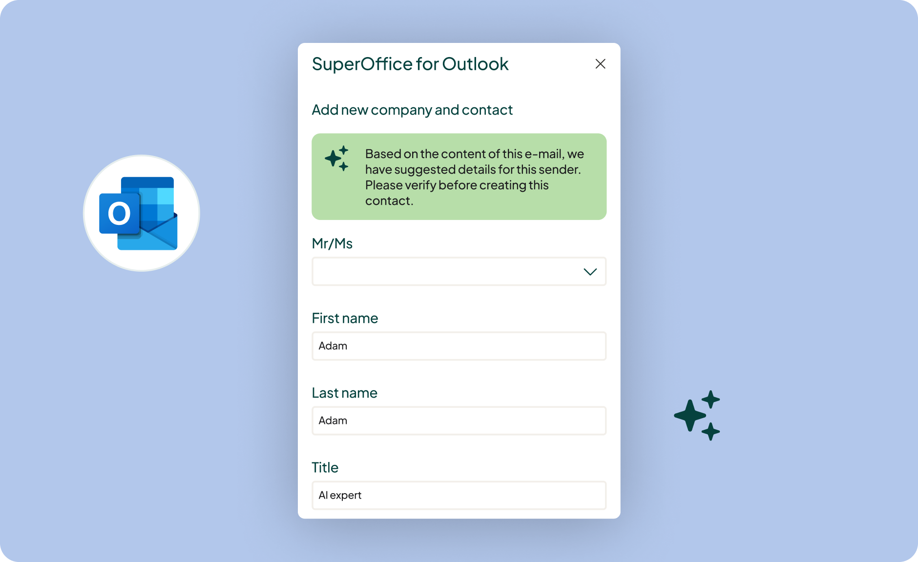 Spar tid med automatiske udfyldningsforslag til dine SuperOffice-kontakter i Outlook. SuperOffice Copilot trækker information fra dit CRM-system for at foreslå feltindtastning for dine nye kontakter.