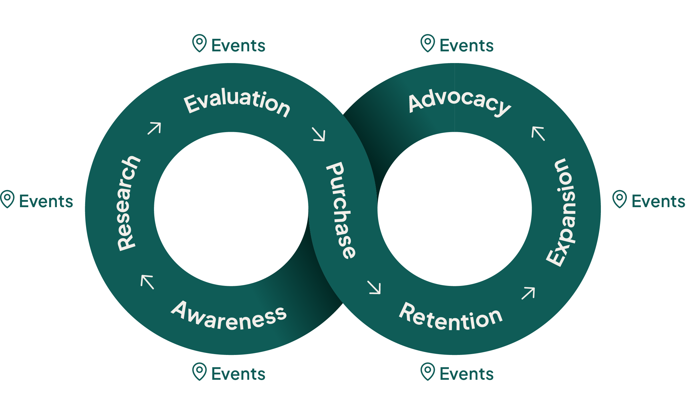 Events fungerer som accelerator på tværs af opmærksomhed, informationssøgning, evaluering, fastholdelse og anbefalinger. Når de er forbundet med CRM, hjælper de med at udvikle relationer med afklaring og tillid.