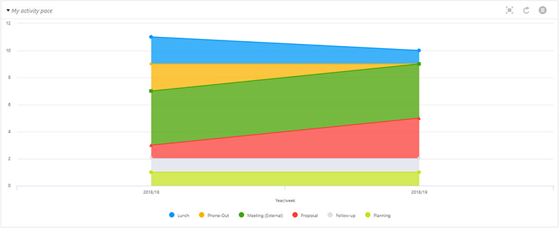 Det er nemt at se, om du bruger bestemte aktiviteter oftere end andre. Når du f.eks. har et stort antal lukkemøder, men kun få førstegangsmøder med nye kundeemner, kan du beslutte, hvilke aktiviteter du ønsker at prioritere for at skabe balance.